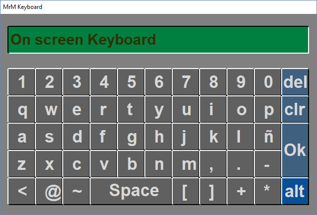One of the most frustrating limitations of previous versions of mgsLib was the impossibility to enter normal text in a graphic application, in a simple way. To solve this lack, the current version of mgsLib includes an easy to use, On Screen Keyboard as depicted on the image. It is an indepedent window fully handled by the mrmWidgets system. Clicking with the mouse on any of the normal keys adds the corresponding character to the text that appears on the small display. There are are also a set of special keys of evident use:
